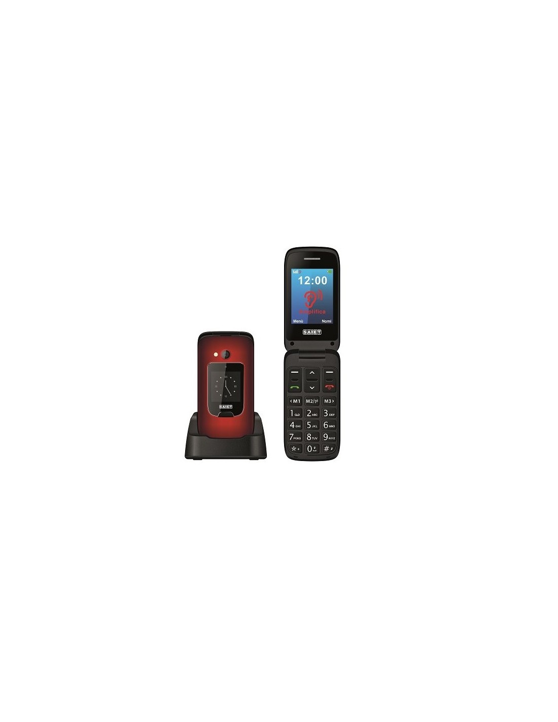 Telefono GSM con tasti e caratteri grandi, doppio Display, tasto SOS, tasto di extra AMPLIFICATO AUDIO, suoneria Alta, regolazione frequenza audio, tasti M1 M2 M3 per chiamate dirette, 8 foto contatti, tasti parlanti, lente di ingrandimento, fotocamera, bluetooth, torcia a Led, base di appoggio e ricarica.