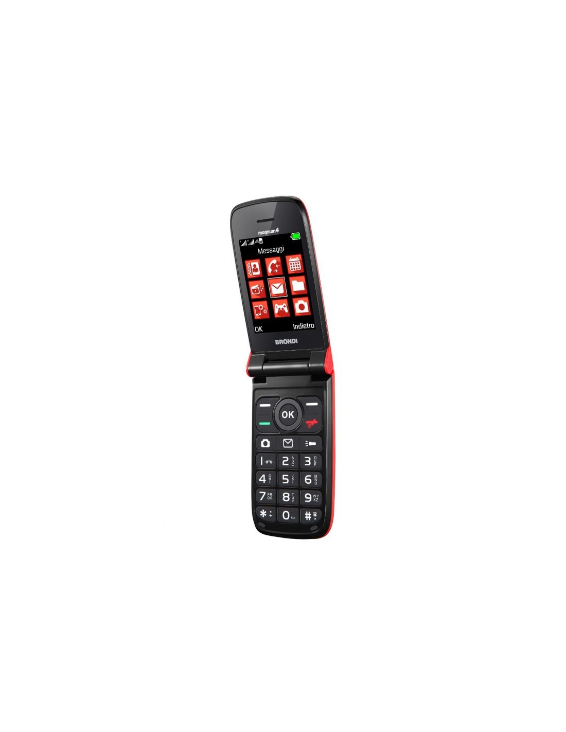 Il MAGNUM 4 della BRONDI è un telefono cellulare Clamshell GSM Dual SIM fornito di maxi display da 2.8 pollici per favorire una maggiore facilità di visualizzazione delle icone e della navigazione grazie ai caratteri grandi del Magnum 4.