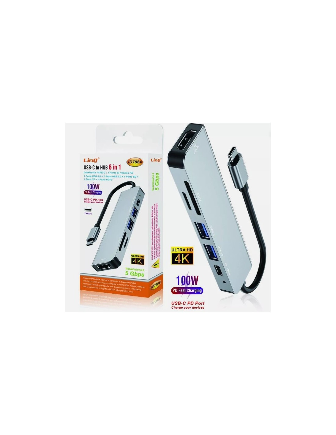 ID7964 Hub USB-C 6 in 1 4K HDMI 100W PD 5Gbps SD/TF