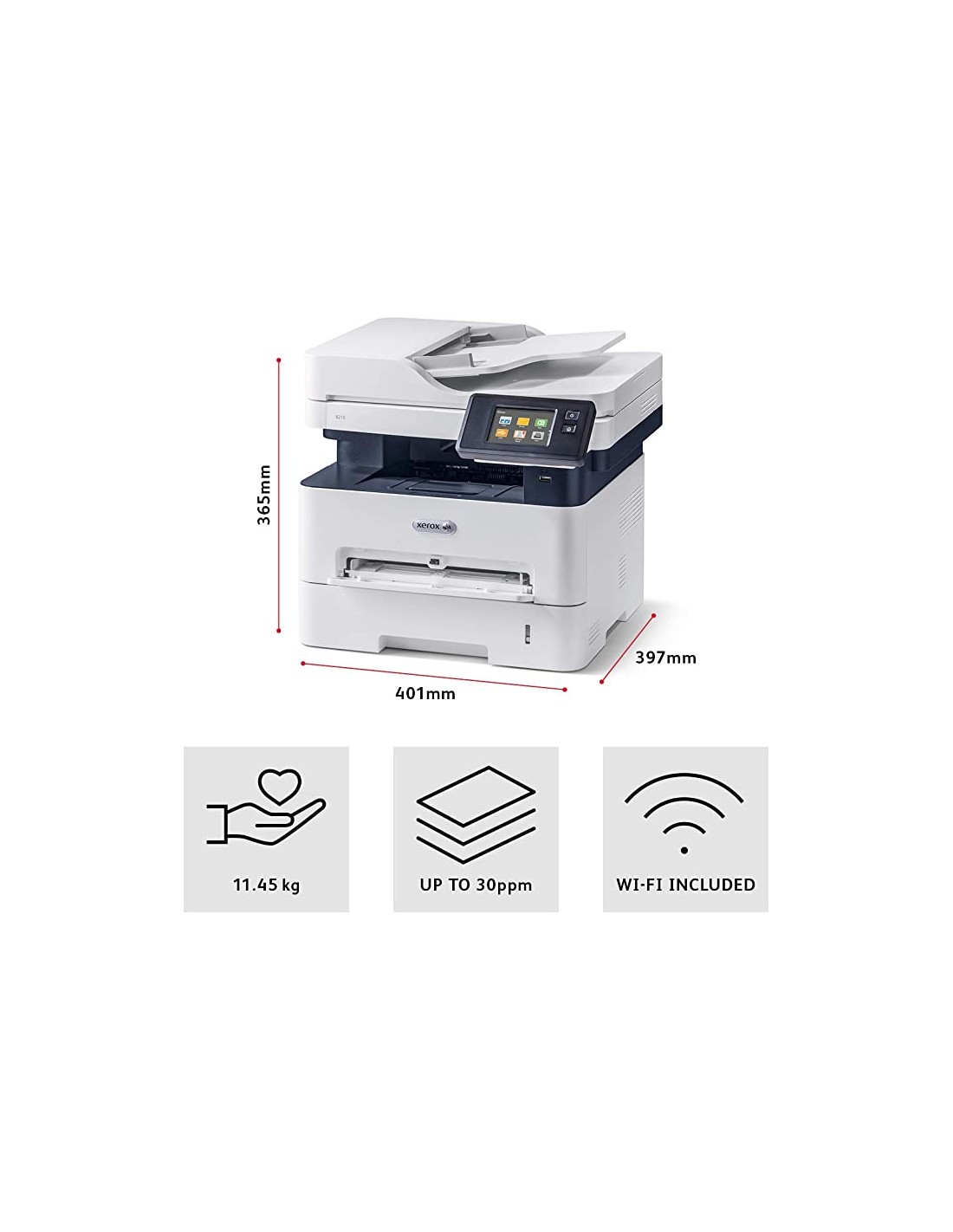 Descrizione Xerox B215 A4 30 ppm Copia/Stampa/Scansione/Fax fronte/retro wireless PS3 PCL5e/6 ADF 2 vassoi Totale 251 fogli
